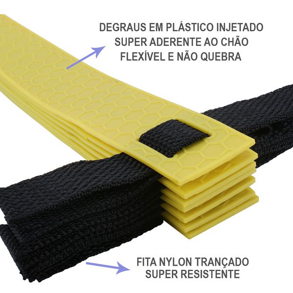 • Material: Degraus feitos de PVC rígido e resistente, que não quebra, e fitas de nylon coloridas com costuras reforçadas.