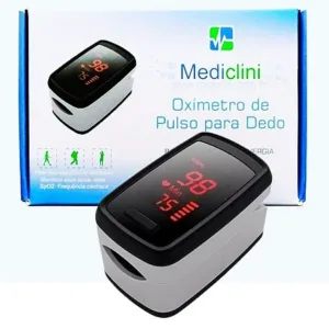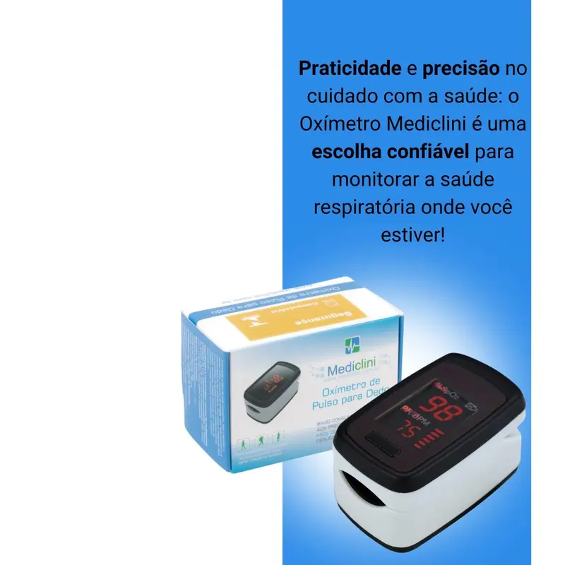 O oxímetro de pulso Mediclini é um aparelho portátil e não invasivo, usado para medir a saturação de oxigênio no sangue e a frequência cardíaca. Ele possui um design compacto, visor OLED ou LED, baixo consumo de energia, desligamento automático e é ideal para uso doméstico e clínico, sendo fácil de operar. O produto utiliza duas pilhas AAA e, em alguns modelos, possui ajuste automático da rotação da tela para facilitar a visualização.