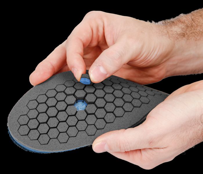 A palmilha mosaico oferece um alívio de pressão personalizado a cada usuário pois incômodos ou ferimentos na região plantar podem ser imediatamente aliviados, basta retirar pinos adesivos removíveis que ficam na parte inferior da palmilha.