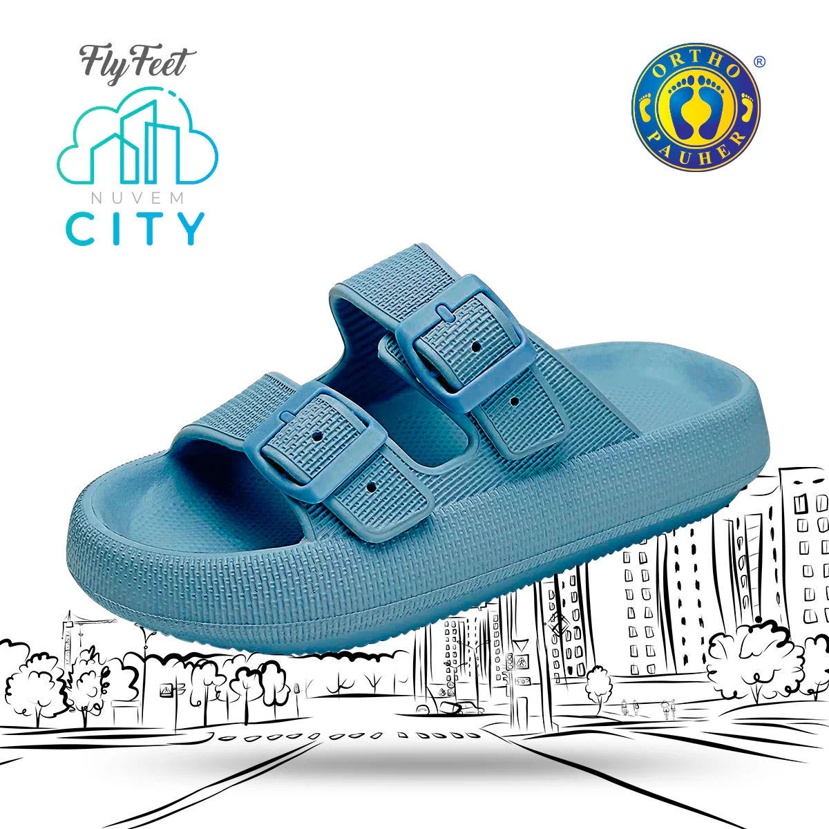 A Sandália Ortopédica Fly Feet Nuvem City possui características anatômicas e singulares no solado que a torna uma palmilha ortopédica única. A Espessura extra de quase 4cm estimula o contato total da planta dos pés contra a sandália em todas as fases da pisada, e isso equilibra e distribui o peso por toda a região plantar diminuindo uniformemente os pontos de pressão. A ação anti-impacto e maciez somado a modificação na forma de pisar auxiliam diretamente na proteção e prevenção primária e/ou secundária para esporão de calcâneo, fascite plantar, neuroma de Morton, metatarsalgia, formação de calos, hiperqueratose, alívio das dores e pressão no calcanhar. Também indicada para deformidades do joanete, possui abertura lateral para alívio da pressão e dores causadas pela protuberância do hallux Valgus. Possui abertura frontal objetivando igualmente o alívio do atrito e dores para dedos em garra.