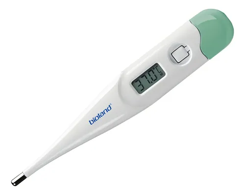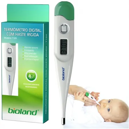 O termômetro digital com haste rígida Bioland é um aparelho para medir a temperatura corporal de forma rápida e precisa, com características como alarme sonoro ao final da medição, desligamento automático e memória da última leitura. É à prova d’água, resistente a quedas, possui indicação de bateria fraca e é aprovado pela ANVISA e INMETRO.